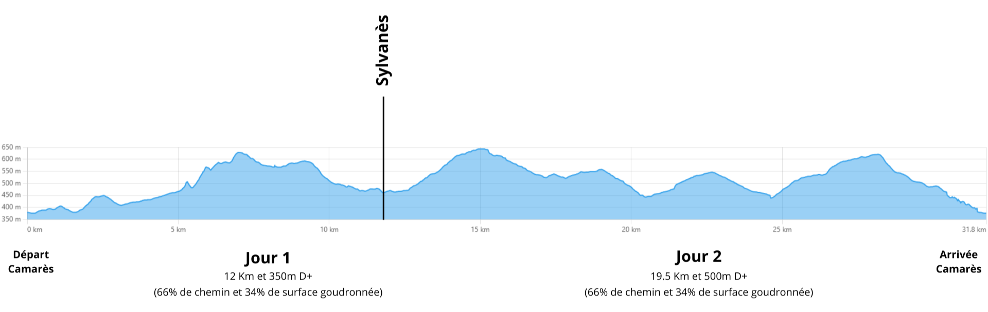 Pédestre : Un itinéraire de 19,5 km avec 500 m de dénivelé, plus sportif, vous mène de Sylvanès à Camarès. Le type de sol est identique au premier jour, c'est-à-dire 66% de chemins et 34% de goudrons. Traversez la forêt jusqu’à l’Eglise Russe, avant de remonter sur les hauteurs et d'admirer les environs ainsi que le calme de la nature du sud-Aveyron. Il est possible de faire seulement 12.5km et 300mD+ si vous ne voulez pas visiter l'Eglise russe.